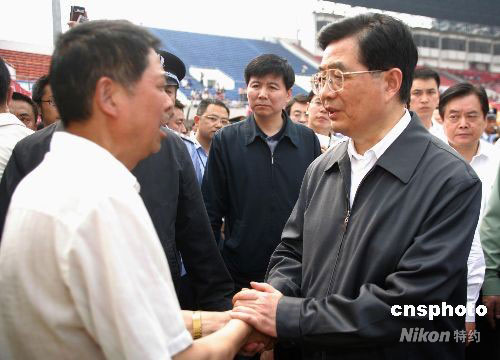 5月16日15時,中共中央總書記、國家主席胡錦濤來到四川綿陽市南和體育中心救助站看望受災民眾。中新社發 劉震 攝