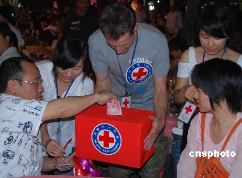 連日來,桂林全城涌動捐款熱潮,截至五月十九日下午六時,桂林市民眾為四川地震災區募集善款一千六百六十二點九六萬元人民幣。圖為外國游客在陽朔西街協助桂林紅十字會工作人員募捐。