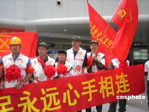 五月二十日,首批海南青年醫療衛生抗震救災志愿者服務隊共二十五人,從海口美蘭機場出發,前往四川綿陽平武縣抗震救災。該批具有專業醫療技能及抗震經驗的志愿者,來自海南省人民醫院、海南省及各市縣疾控中心,由海南省衛生廳及共青團海南省委共同招募。