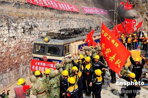 5月24日上午,首列滿載運(yùn)往四川災(zāi)區(qū)救災(zāi)物資的搶977次列車,從寶成線徽縣至虞關(guān)站間109號隧道安全通過,這標(biāo)志著因地震塌方在隧道內(nèi)脫線起火、中斷行車283小時(shí)的寶成鐵路全線,比預(yù)計(jì)時(shí)間提前7天恢復(fù)通車。 寶成鐵路是通往西南的鐵路大動脈,是四川抗震救災(zāi)的生命線。5月12日14時(shí)28分,因四川汶川發(fā)生8級強(qiáng)烈地震引發(fā)山體崩塌,致使運(yùn)行中的一列貨物列車在西安鐵路局管內(nèi)寶成線徽縣至虞關(guān)站間撞巨石脫線,12節(jié)裝有汽油的罐車被埋在109號隧道中起火燃燒,造成通往四川地震災(zāi)區(qū)的大動脈寶成鐵路中斷行車。險(xiǎn)情發(fā)生后,經(jīng)過鐵路職工、解放軍指戰(zhàn)員、武警官兵等2200多名搶險(xiǎn)人員連續(xù)12個(gè)晝夜奮力搶修,終于將寶成鐵路109號隧道順利搶通。