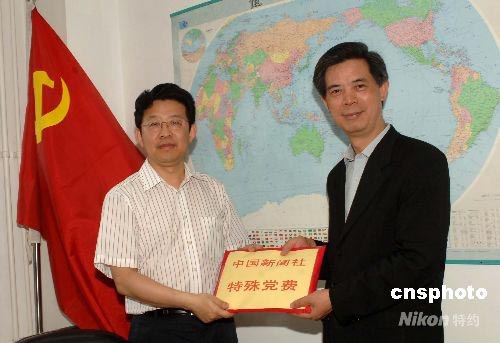 6月3日,中國新聞社社長郭招金(右)將本社全體中共黨員自愿交納的支援四川地震災區特殊黨費,上交有關部門。這筆特殊愛心捐款,將轉交四川地震災區幫助當地人民抗震救災、重建家園。中新社發 鄒憲 攝