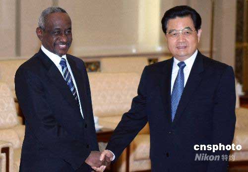 中國國家主席胡錦濤,6月11日在北京人民大會堂會見蘇丹共和國副總統(tǒng)阿里·奧斯曼·穆罕默德·塔哈。阿里·奧斯曼·穆罕默德·塔哈副總統(tǒng)是應中國國家副主席習近平的邀請,于6月9日至15日對中國進行正式訪問。中新社發(fā) 任晨鳴 攝