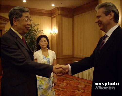 7月8日晚,當羅馬尼亞駐華大使伊斯蒂奇瓦亞(右)用一口流利的中文與十屆全國人大常委會副委員長許嘉璐(左)進行著一次關于全球化背景下語言作用的深刻對話時,漢語無疑搭建了一座溝通中國與世界心靈與思想的橋梁。 包括伊斯蒂奇瓦亞及秘魯、保加利亞、孟加拉、印尼等國的駐華使節,隨55個國家的100多名大學生漢語愛好者一道來到湖南長沙,這些學生將參加第七屆“漢語橋”世界大學生中文比賽。當晚,許嘉璐在長沙會見了駐華使節一行。中新社發 傅煜 攝