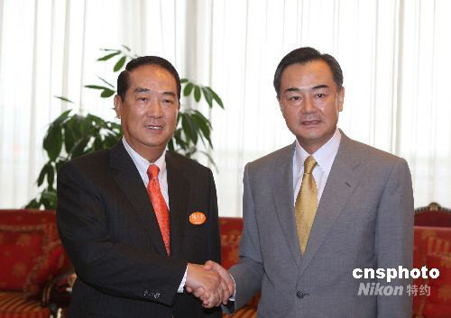 8月6日,中共中央臺辦主任王毅在北京首都國際機場歡迎應邀出席北京奧運會開幕式的親民黨主席宋楚瑜一行。中新社發 廖文靜 攝