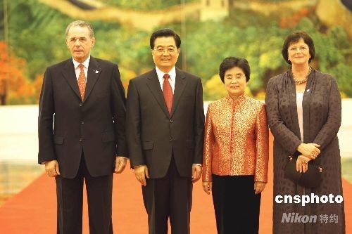 圖:胡錦濤夫婦歡迎羅格出席北京奧運(yùn)會