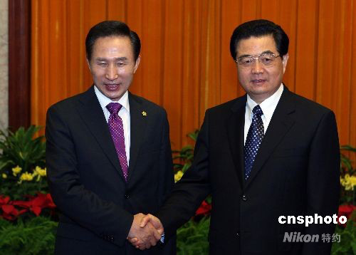8月9日,中國國家主席胡錦濤在北京人民大會堂會見韓國總統李明博。中新社發 廖文靜 攝