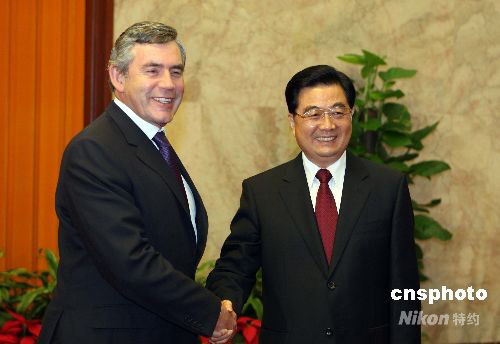 8月22日,中國國家主席胡錦濤在北京人民大會堂會見英國首相布朗。中新社發 廖文靜 攝