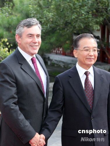 8月22日,中國國務院總理溫家寶在北京釣魚臺國賓館會見英國首相布朗。中新社發 廖文靜 攝