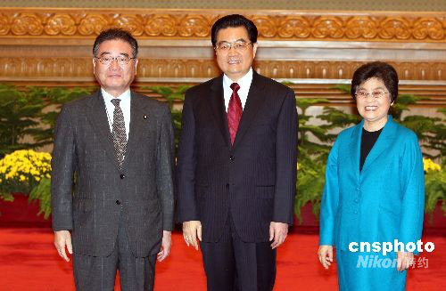 9月6日,國家主席胡錦濤夫婦在北京人民大會堂歡迎出席2008年殘奧會的各國貴賓。圖為胡錦濤夫婦歡迎日中友好協會會長加藤弘一先生。中新社發 任海霞 攝