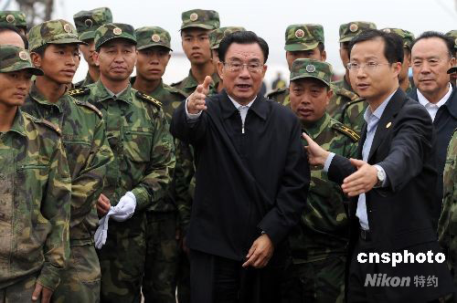 9月24日,出席寧夏回族自治區(qū)成立50周年慶祝活動(dòng)的中央代表團(tuán)團(tuán)長賀國強(qiáng)來到固原市,向正在為當(dāng)?shù)孛癖姶蚓膶幭能妳^(qū)官兵們表示慰問。寧夏軍區(qū)一個(gè)給水團(tuán)正實(shí)施新一輪“百井支農(nóng)富民”工程,初步解決近5萬人用水問題。中新社發(fā) 廖攀 攝