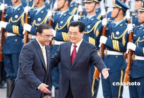 10月15日下午,中國國家主席胡錦濤在北京人民大會堂東門外廣場舉行儀式,歡迎巴基斯坦總統扎爾達里訪華。扎爾達里總統是應胡錦濤的邀請從10月14日至17日對中國進行國事訪問,這是扎爾達里就任總統后的首次正式出訪。中新社發 任晨鳴 攝
