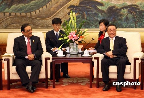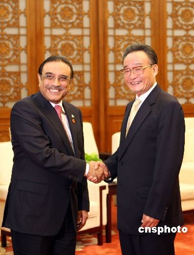 十月十六日,全國人大常委會委員長吳邦國在北京人民大會堂會見巴基斯坦總統扎爾達里一行。中新社發 任海霞 攝