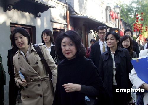 10月24日,日本首相麻生太郎夫人鈴木千賀子(中)游覽北京南鑼鼓巷,領略京城胡同文化。當日,有著800年歷史的北京南鑼鼓巷第三屆“胡同節暨創意集市”開幕,融老北京市井風情和創意文化于一體的該活動以“迎亞歐峰會、展南鑼風采”為主題。中新社發 富田 攝