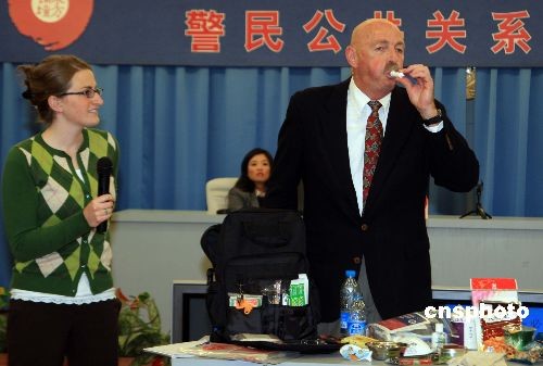 10月30日,來(lái)自美國(guó)猶他州公共安全部的資深培訓(xùn)官特德·沃雷,在上海向基層警察講解“警民公共關(guān)系”,并詳細(xì)介紹美國(guó)警察在社區(qū)微笑招呼、應(yīng)急防衛(wèi)等“秘笈”。中新社發(fā) 潘索菲 攝