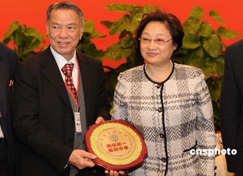 陳永栽向李海峰贈送“兩岸統(tǒng)一 振興中華”紀(jì)念盤。