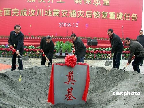 12月3日上午,在四川汶川大地震造成的滑坡山體邊,國道213線汶川至映秀公路的映秀施工現(xiàn)場,汶川地震交通災(zāi)后恢復(fù)重建項(xiàng)目集中開工儀式舉行。交通運(yùn)輸部部長李盛霖,四川省省長蔣巨峰、副省長王寧,四川省交通廳廳長高烽等,揮锨為國道213線汶川至映秀段、省道303線臥龍至日隆段災(zāi)后重建項(xiàng)目奠基。中新社發(fā) 楊杰 攝