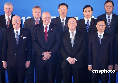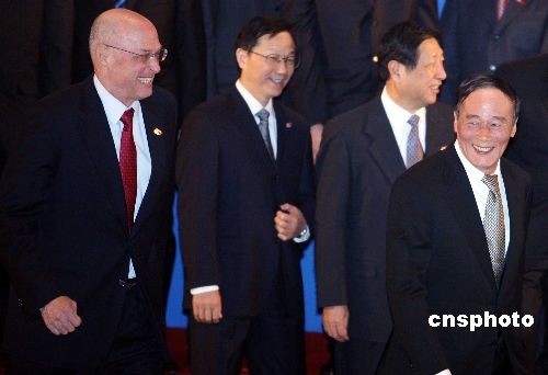 12月5日上午,第五次中美戰略經濟對話在北京釣魚臺國賓館閉幕前,中國國務院副總理王岐山和美國財政部部長保爾森以及雙方與會人員合影留念。中美戰略經濟對話是2006年9月由中國國家主席胡錦濤和美國總統布什發起設立的,是中美現有20多個磋商機制中級別最高的一個。對話每年兩次,輪流在中美舉行。中新社發 任晨鳴 攝