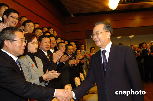 12月13日晚,正在日本福岡出席中日韓三國領導人會議的中國總理溫家寶親切接見了當地華人華僑及中國駐日使館和駐福岡總領館人員,鼓勵大家面對世界性的金融和經濟危機,要有戰(zhàn)勝困難的決心。 中新社發(fā) 朱沿華 攝
