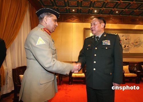10月16日晚,國務委員兼國防部長梁光烈上將,在北京釣魚臺國賓館會見來訪的巴基斯坦參聯會主席塔里克·馬吉德,雙方在友好的氣氛中進行了交談,副總參謀長張黎上將等也參加了會見。中新社發 王麗南 攝