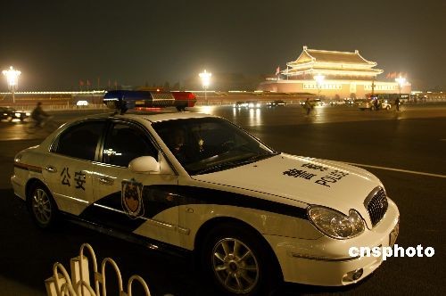 3月3日晚,北京警方在天安門廣場周邊加強夜間巡邏,確!皟蓵卑踩。中新社發 鄭雄增 攝