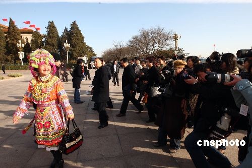 3月9日,十一屆全國人大二次會議在人民大會堂舉行第二次全體會議,穿著亮麗民族服飾的女代表成為攝影記者追逐的對象。中新社發 杜洋 攝