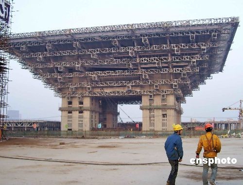 2009年3月25日消息,上海世博會場館建設正在有條不紊地進行。上海世博會執委會副主任周漢民透露,中國館目前已經封頂,今年年底建設將全部完成。中國館是上海世博會的標志性建筑,將永久地保存。中新社發 井韋 攝