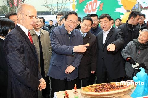 3月27日,2010年上海世博會倒計時400天,上海市舉行一系列發布與紀念活動。中共中央政治局委員、上海市委書記俞正聲參加迎世博會倒計時400天活動時,觀看服務行業技能展示。中新社發 湯彥俊 攝