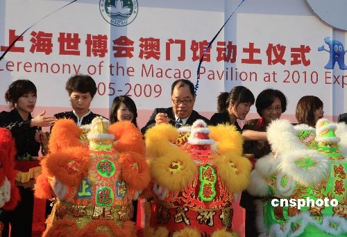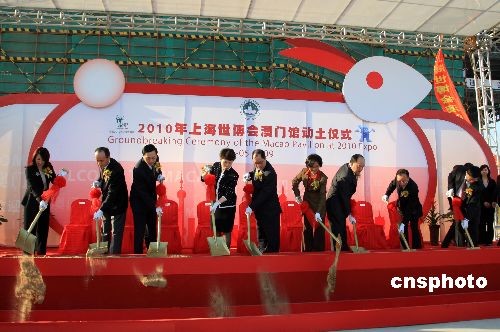 5月8日,2010年上海世博會(huì)澳門館舉行動(dòng)土儀式。澳門特別行政區(qū)經(jīng)濟(jì)財(cái)政司司長(zhǎng)譚伯源、中央人民政府駐澳門特別行政區(qū)聯(lián)絡(luò)辦公室副主任高燕、上海世博會(huì)執(zhí)行委員會(huì)專職副主任鐘燕群等為儀式主禮,來(lái)自澳門的立法議員、人大代表、工商界以及國(guó)際商會(huì)代表等超過150人出席儀式。澳門館─“玉兔宮燈”位于中國(guó)館區(qū),主體建筑高19.99米,寓意澳門回歸的年份1999,別具意義。中新社發(fā) 潘索菲 攝