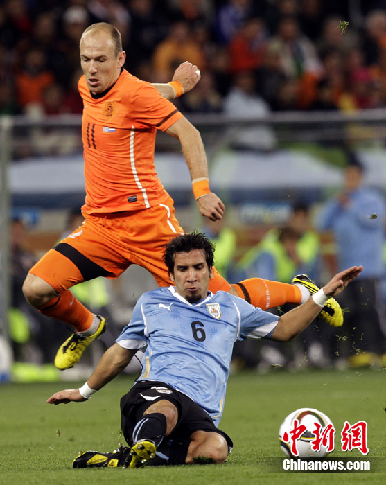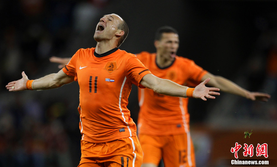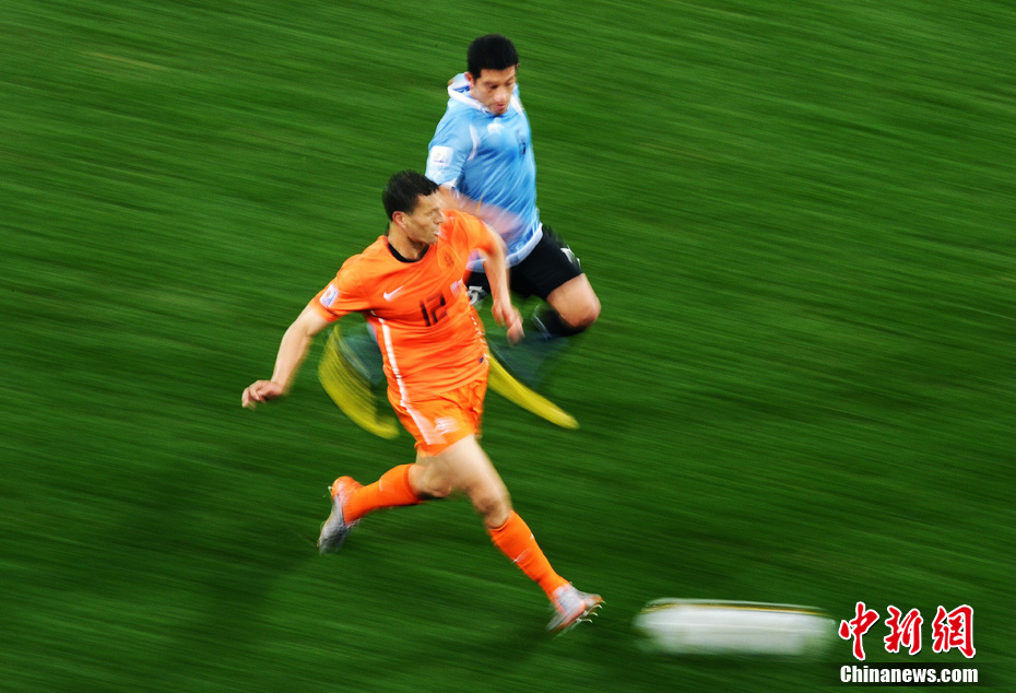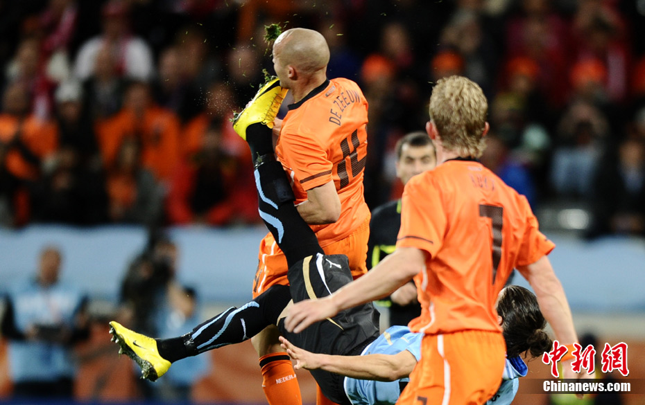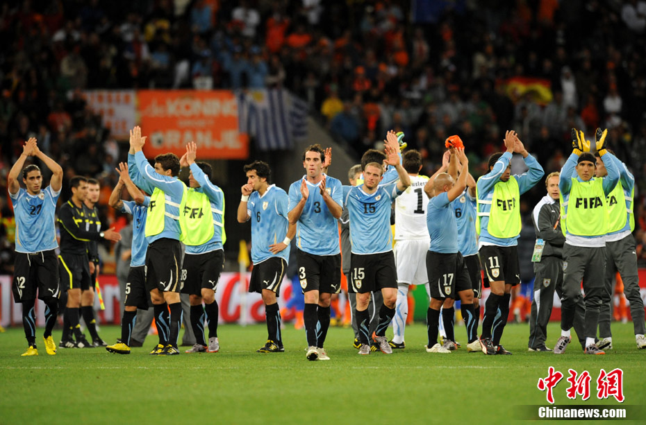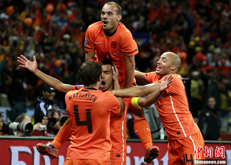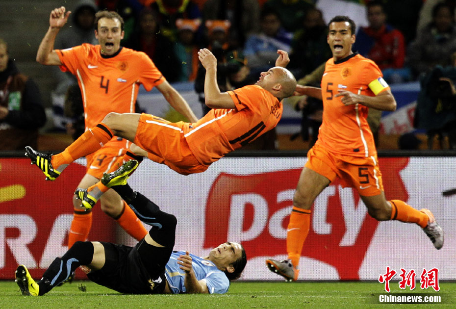 7月7日凌晨2:30,南非世界杯半決賽首場(chǎng)較量在開普敦綠點(diǎn)球場(chǎng)拉開戰(zhàn)幕,由南美老牌勁旅烏拉圭迎戰(zhàn)荷蘭隊(duì)。布隆克霍斯特遠(yuǎn)射先拔頭籌,而弗蘭也通過一記遠(yuǎn)射將比分扳平。下半場(chǎng)斯內(nèi)德和羅本連續(xù)進(jìn)球一度令荷蘭隊(duì)鎖定勝局,然而補(bǔ)時(shí)階段烏拉圭人的進(jìn)球似乎又燃起了最后的希望,但荷蘭隊(duì)頂住了對(duì)手的瘋狂進(jìn)攻,3-2擊敗烏拉圭隊(duì),成功挺進(jìn)決賽。