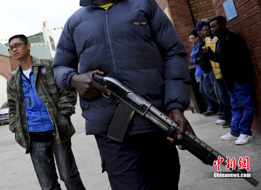 南非華人安保公司總經(jīng)理謝宇航與南非當(dāng)?shù)貑T工持槍在約翰內(nèi)斯堡中國(guó)商貿(mào)城內(nèi)巡邏。約翰內(nèi)斯堡被稱為全世界最危險(xiǎn)的城市之一。世界杯期間,南非的這種保安公司不僅受雇為球隊(duì)做保鏢,而且在警力不足的情況下,許多保安公司受雇于警方,成為保衛(wèi)世界杯安全的一支重要力量。而南非華人安保公司也是其中之一,他們的主要服務(wù)對(duì)象是位于約翰內(nèi)斯堡核心城區(qū)的中國(guó)商貿(mào)城。中新社發(fā) 廖攀 攝