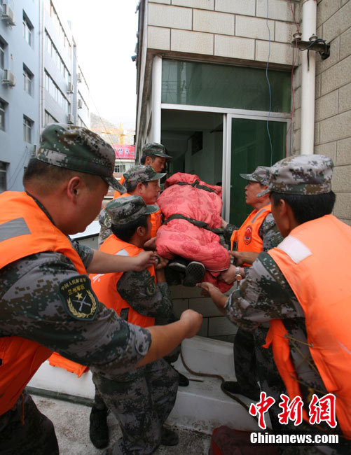 8月10日10時許,甘肅舟曲縣泥石流救援現場的移動大樓附近發現一名幸存者,經過四川廣元軍分區救援人員1小時30分的緊張營救,男子被成功救出。據悉,獲救者叫劉馬勝代,已被埋了近60個小時,今年52歲,是一名殘疾人。目前,有關方面正在緊急調集直升機將其轉移至蘭州救治。中新社發 劉忠俊 攝