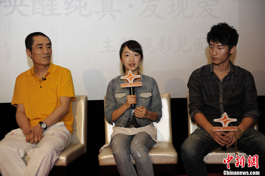 9月16日晚,由國際在線網站,中國國際廣播電臺輕松調頻91.5以及北京新畫面影業公司共同打造的“喚醒純真·發現愛”《山楂樹之戀》北京觀影見面會活動在世界城星美國際影城舉行。《山楂樹之戀》導演張藝謀攜影片兩位主演周冬雨和竇驍一同出席了活動,為觀眾講述了電影《山楂樹之戀》戲里戲外的故事。 中新網記者 王紅綱攝