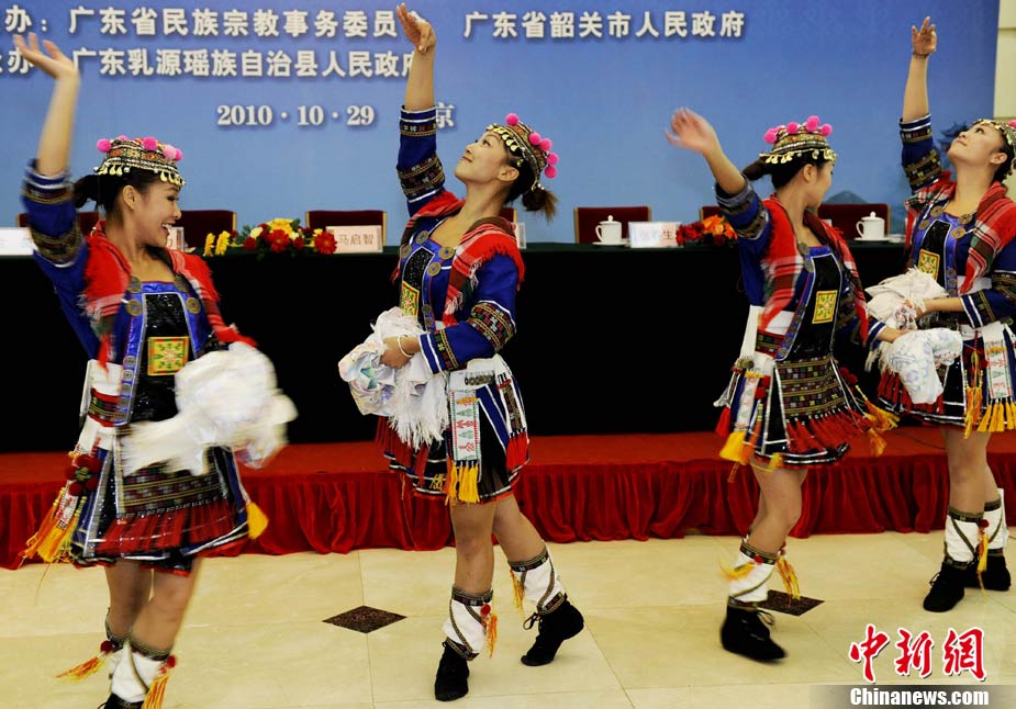 10月29日,第十一屆中國瑤族盤王節新聞發布會暨世界過山瑤之鄉——中國乳源旅游推介會在人民大會堂召開。本次會議發布,世界瑤族人民的盛會——第十一屆中國瑤族盤王節將于2010年11月20日至22日在廣東乳源瑤族自治縣隆重舉行。瑤族盤王節是瑤族人民紀念其始祖盤王(盤瓠)的盛大節日。圖為“瑤族公主”形象代表身著湘粵桂南嶺地區的瑤族盛裝亮相新聞發布會。中新社記者 劉震 攝
