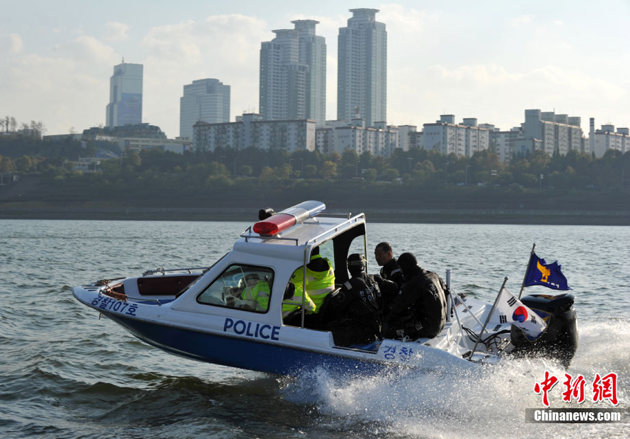 當地時間11月3日,韓國首爾附近的漢江中韓國水警舉行了針對G20峰會安保工作的演練。