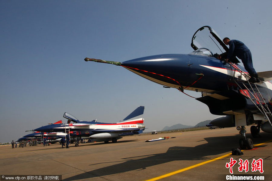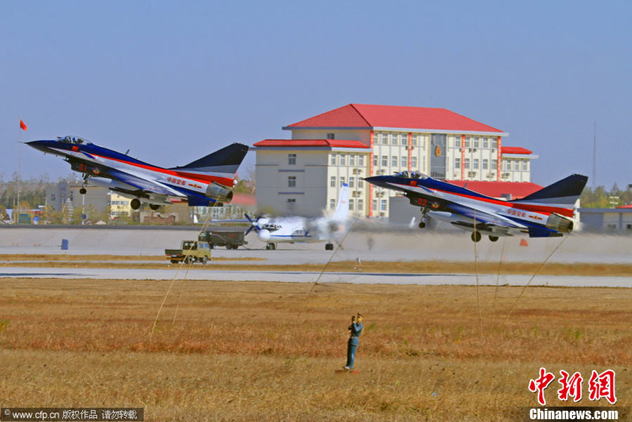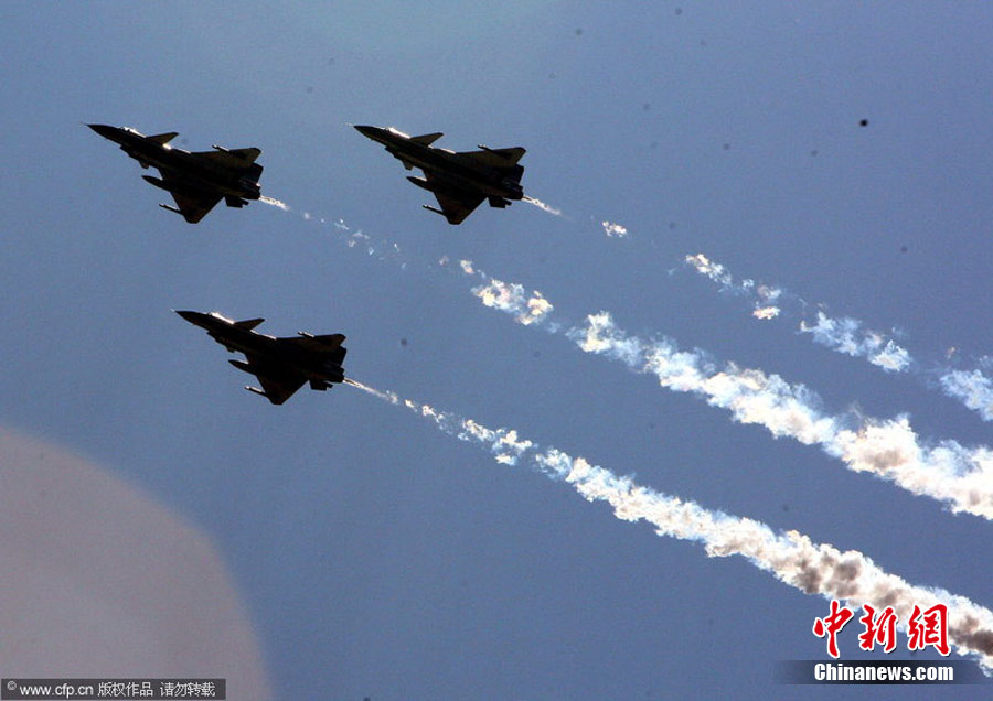 2010年11月8日,中國空軍“八一”飛行表演隊的7架殲十表演機從華北某機場起飛,經過約2個半小時的飛行,飛抵珠海三灶機場。將在珠海航展上進行一系列的精彩特技表演。林森 攝 圖片來源:CFP視覺中國