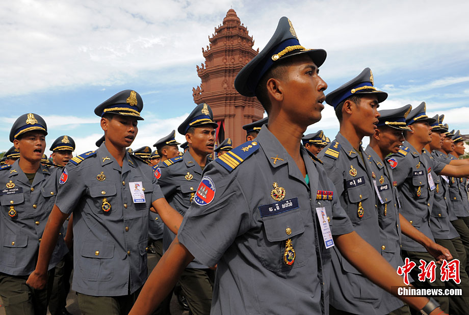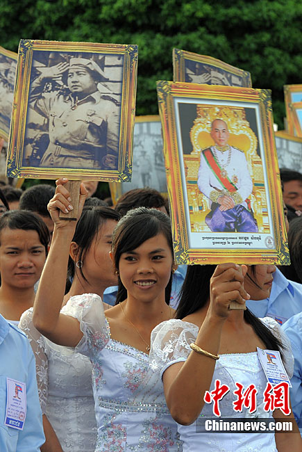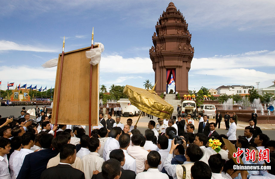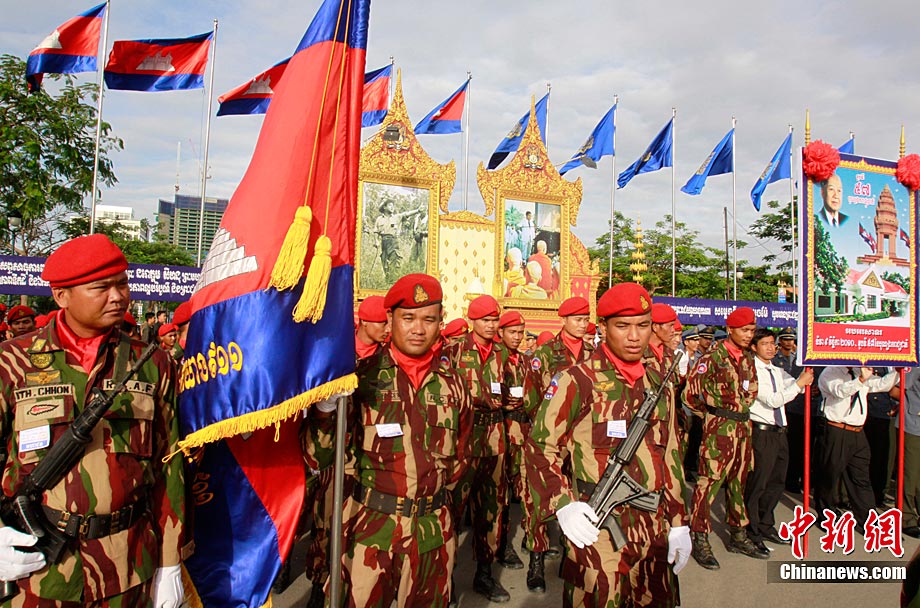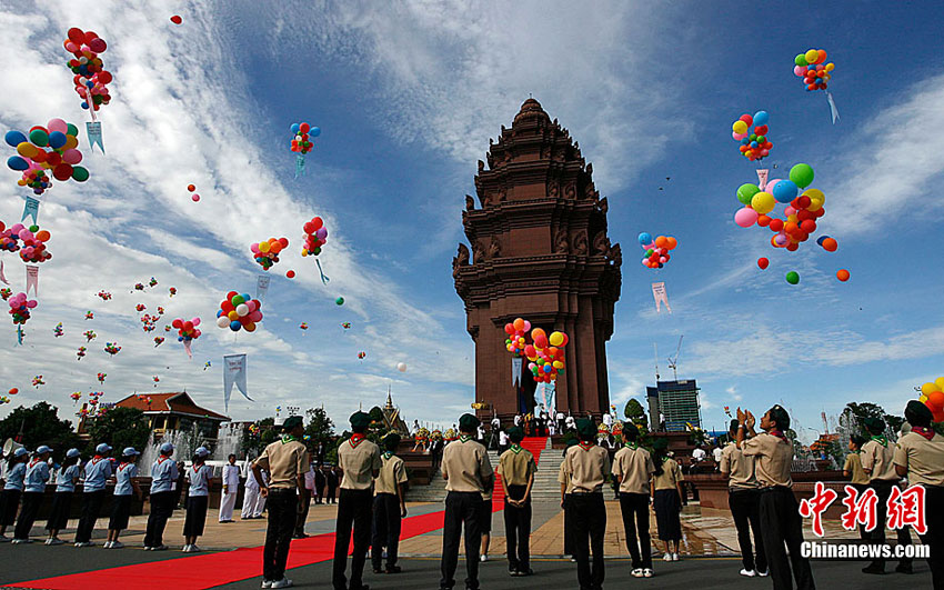 11月9日,工作人員在獨立節慶祝儀式上放飛彩球。當天,柬埔寨在金邊獨立紀念碑廣場舉行盛大儀式,熱烈慶祝國家獨立57周年。柬埔寨國王西哈莫尼、國會主席韓桑林、政府首相洪森等政要以及各國駐柬使節和各界代表約2萬人出席儀式。
