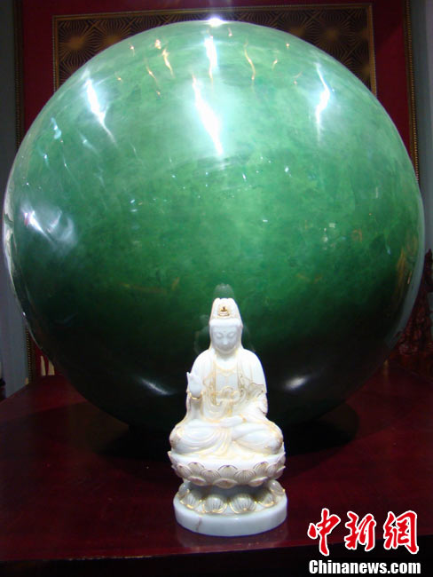 11月21日,一顆重達6噸,直徑1.6米,業內估計價值22億人民幣的夜明珠,在海南僑文昌寶玉宮展出。圖為模特擁抱夜明珠。中新社發 付美斌 攝