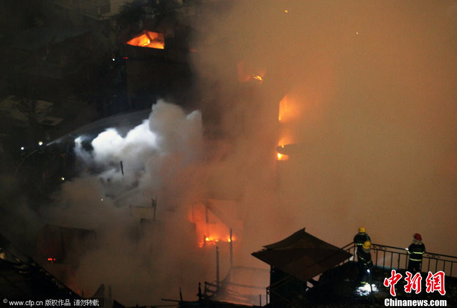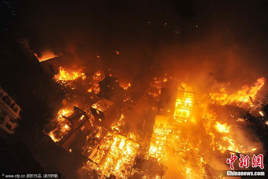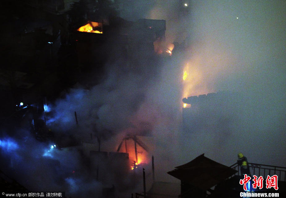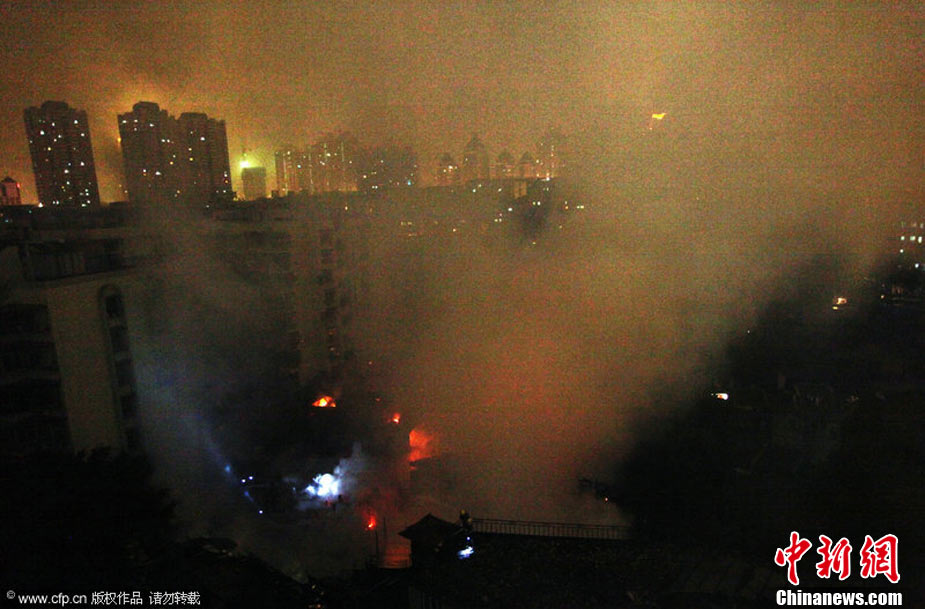 2010年11月21日晚近22時,福州臺江區新港街道中選社區附近一片民房發生火災,由于該民房附近主要為棚屋結構,大火迅速蔓延,燃燒一個多小時,火勢非常猛烈。劉影 攝 圖片來源:CFP視覺中國