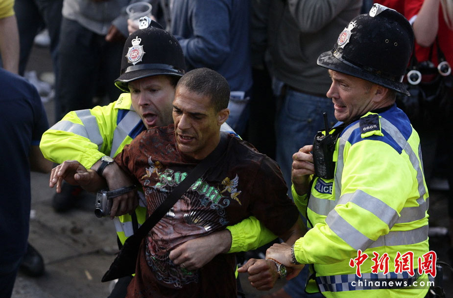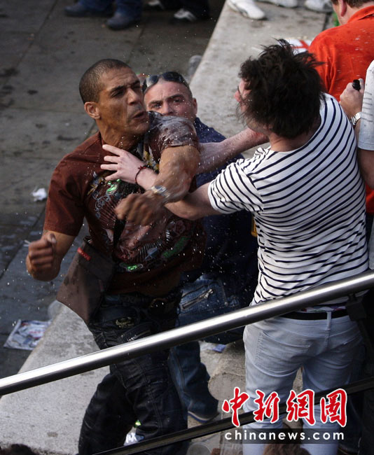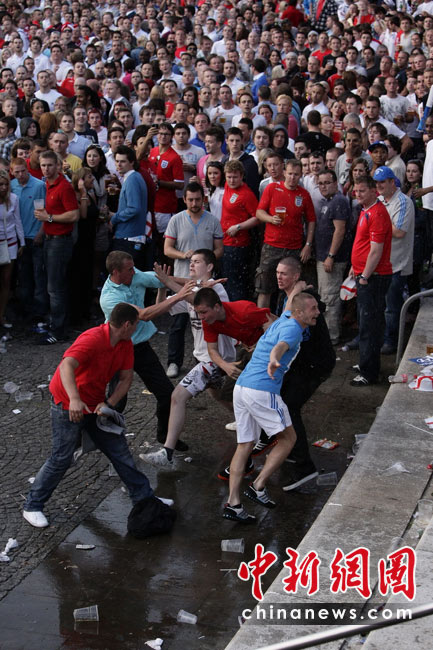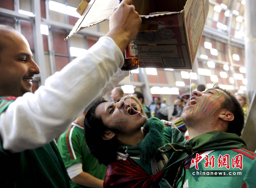 6月11日,南非世界杯揭幕戰在約翰內斯堡足球城球場舉行,中場休息時球迷在休息區舉箱豪飲啤酒。中新社記者 廖攀 攝