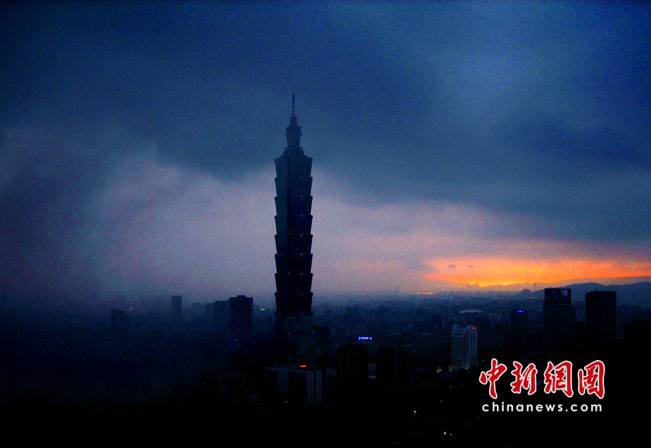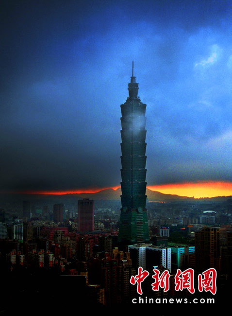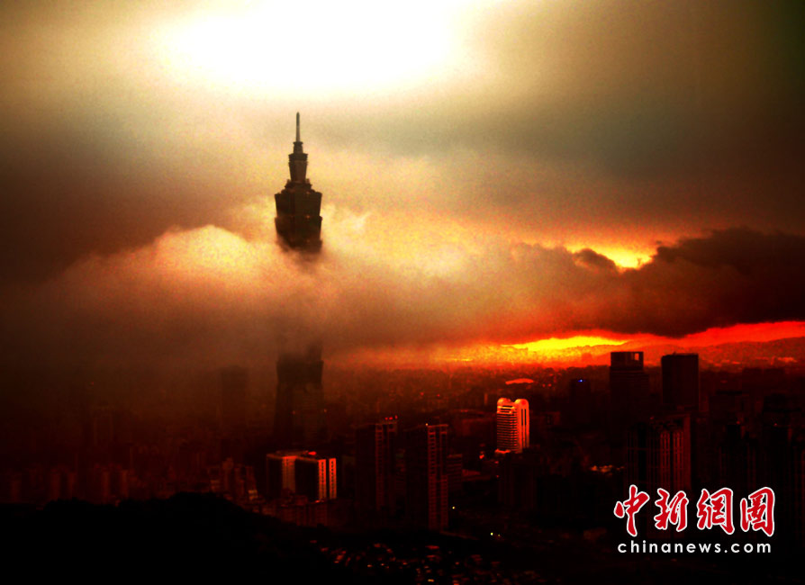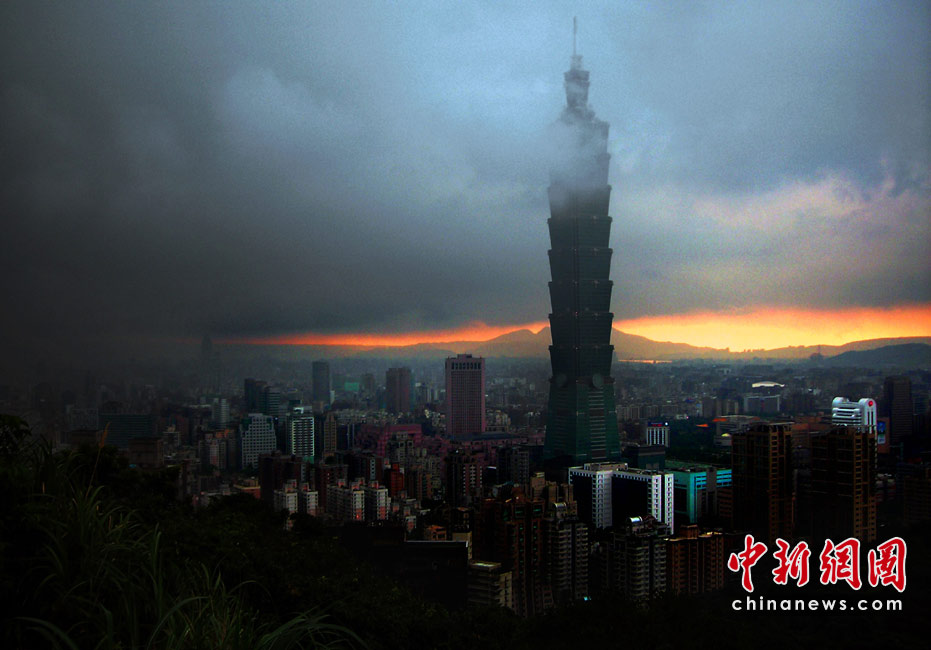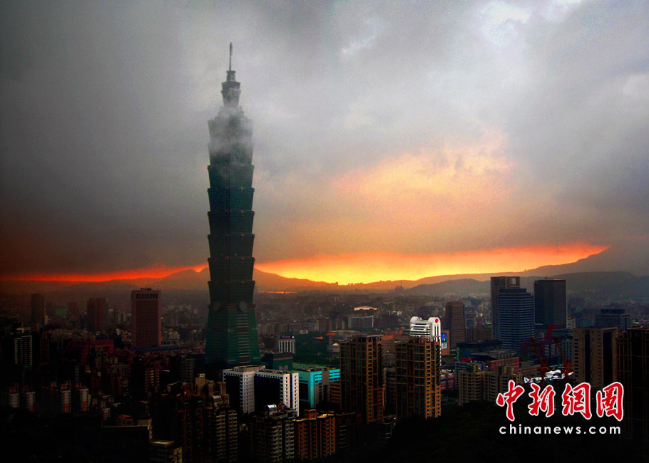 6月28日傍晚,臺(tái)北市一陣大雨后,從象山俯瞰市區(qū),101摩天大樓聳入云霄,后山紅云如火,景觀如畫。美麗的臺(tái)北市地處盆地,氣候多變,夏季的城市景色也時(shí)常變幻莫測(cè)。中新社記者 宋吉河攝