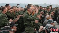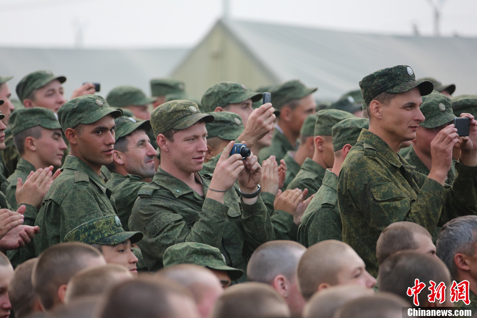 8月10日,隨同中方參演部隊赴俄羅斯參加“和平使命-2013”中俄聯(lián)演的沈陽軍區(qū)政治部文工團演員們,為中俄千余名參演官兵獻上了一場精彩的文藝晚會。豐富多彩的文藝節(jié)目,將位于切巴爾庫爾訓(xùn)練場的中俄聯(lián)演野營村,變成了友誼的盛會、歡樂的海洋。 圖為精彩節(jié)目吸引俄國官兵。中新社發(fā) 李祥輝 攝