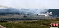 8月12日,“和平使命-2013”聯合反恐軍演中俄兩軍參演部隊在切巴爾庫爾合同訓練場舉行全員全要素實兵協同訓練。雙方共出動官兵近900人,坦克、步戰車、直升機等武器裝備約130臺,雙方導演部總導演——俄中部軍區司令員波格諾夫斯基和沈陽軍區副司令員石香元,共同到演習地觀摩并指導兩軍訓練。圖為中方坦克戰車對恐怖武裝力量實施火力打擊。中新社發 李祥輝 攝