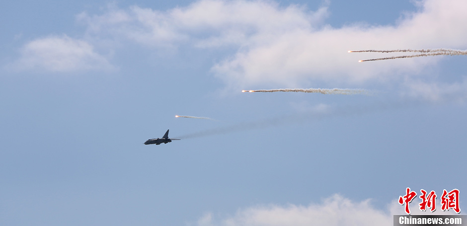 8月12日,“和平使命-2013”聯合反恐軍演中俄兩軍參演部隊在切巴爾庫爾合同訓練場舉行全員全要素實兵協同訓練。雙方共出動官兵近900人,坦克、步戰車、直升機等武器裝備約130臺,雙方導演部總導演——俄中部軍區司令員波格諾夫斯基和沈陽軍區副司令員石香元,共同到演習地觀摩并指導兩軍訓練。圖為空軍戰斗群一架戰斗機在訓練中。中新社發 李祥輝 攝