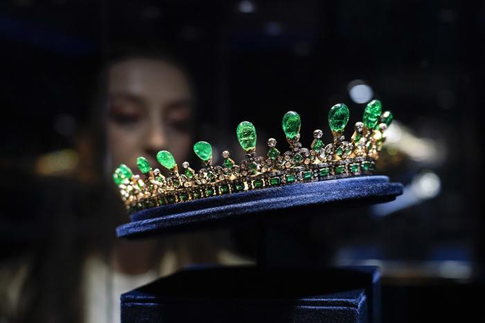 當(dāng)?shù)貢r間5月27日,英國倫敦,為慶祝英國女王伊麗莎白二世登基70周年(也稱“白金禧年”),倫敦蘇富比拍賣行舉辦特展,展出了與女王及王室相關(guān)的珍貴藏品。圖為英國維多利亞女王的祖母綠冠冕。