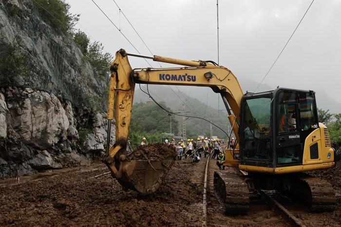 8月1日,北京門頭溝區(qū),豐沙鐵路妙峰山鎮(zhèn)水峪嘴村段,工作人員和大型機(jī)械在鐵路線上清淤。7月29日以來,北京地區(qū)持續(xù)強(qiáng)降雨,西南部降雨量大。受降雨影響,北京豐臺至沙城鐵路(豐沙線)嚴(yán)重水害。