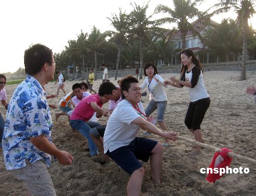 第二屆“歡聚海南大學”兩岸大學生冬令營11月13日舉行“深深相連”沙灘拔河比賽活動。圖為臺灣學生奮力拔河,粉絲團在旁邊吶喊助威。中新社發 彭小云 攝