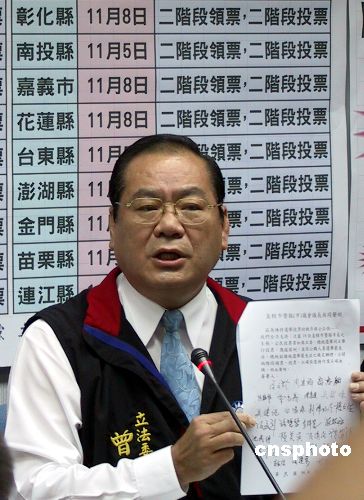 中國國民黨立法院黨團(tuán)十一月十四日表示,支持十八個(gè)縣市選舉委員會(huì)的決定,希望明年“立委”選舉與“公投”同日舉行時(shí),采用“二階段領(lǐng)票,二階段投票”方式,讓選舉順暢單純。圖為國民黨政策會(huì)執(zhí)行長曾永權(quán)出示全臺(tái)灣二十五個(gè)縣市議會(huì)議長的共同聲明,他們表示支持這一投票方式。中新社發(fā) 劉舒凌 攝