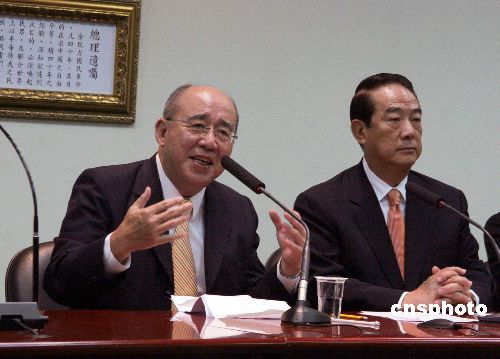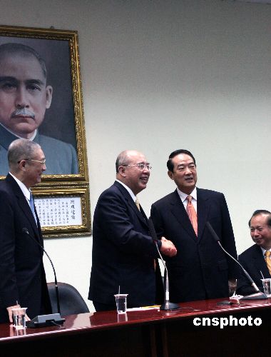 11月14日,中國國民黨主席吳伯雄和親民黨主席宋楚瑜在臺北一起舉行記者會,公布列國民黨34席不分區“立委”提名名單的4名親民黨成員。親民黨另有6位成員獲國親推薦,以國民黨名義參選區域“立委”選舉。中新社發 黃少華 攝