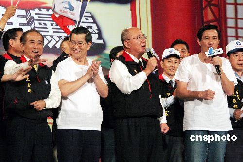 11月24日,中國國民黨在臺灣中部的嘉義市舉行萬人造勢活動,紀念該黨成立一百一十三周年,也為明年臺灣的兩次重要選舉拉抬聲勢。圖為馬英九、蕭萬長、吳伯雄、王金平等全體與會者高唱《我們都是一家人》、《愛拚才會贏》等歌。整個造勢活動突出“拚經濟、顧生活”的訴求和“以臺灣為主,對人民有利”的主題。中新社發 黃少華 攝