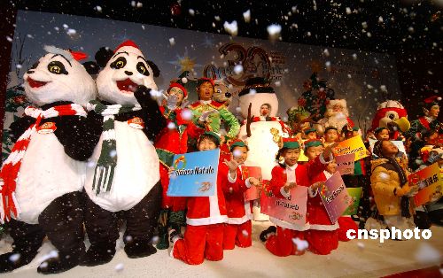11月27日,香港海洋公園宣布,在12月15日至明年1月1日期間,將推出包括“冰雪世界”、“環球圣誕村”、“滿場驚喜玩之不盡”、“大玩特玩”四個主題景點,為市民及游客帶來白色的圣誕 。圖為當日小朋友們、“大熊貓”及雪人在漫天飄雪的白色世界迎接即將到來的圣誕節。中新社發 蔡蔓莉 攝